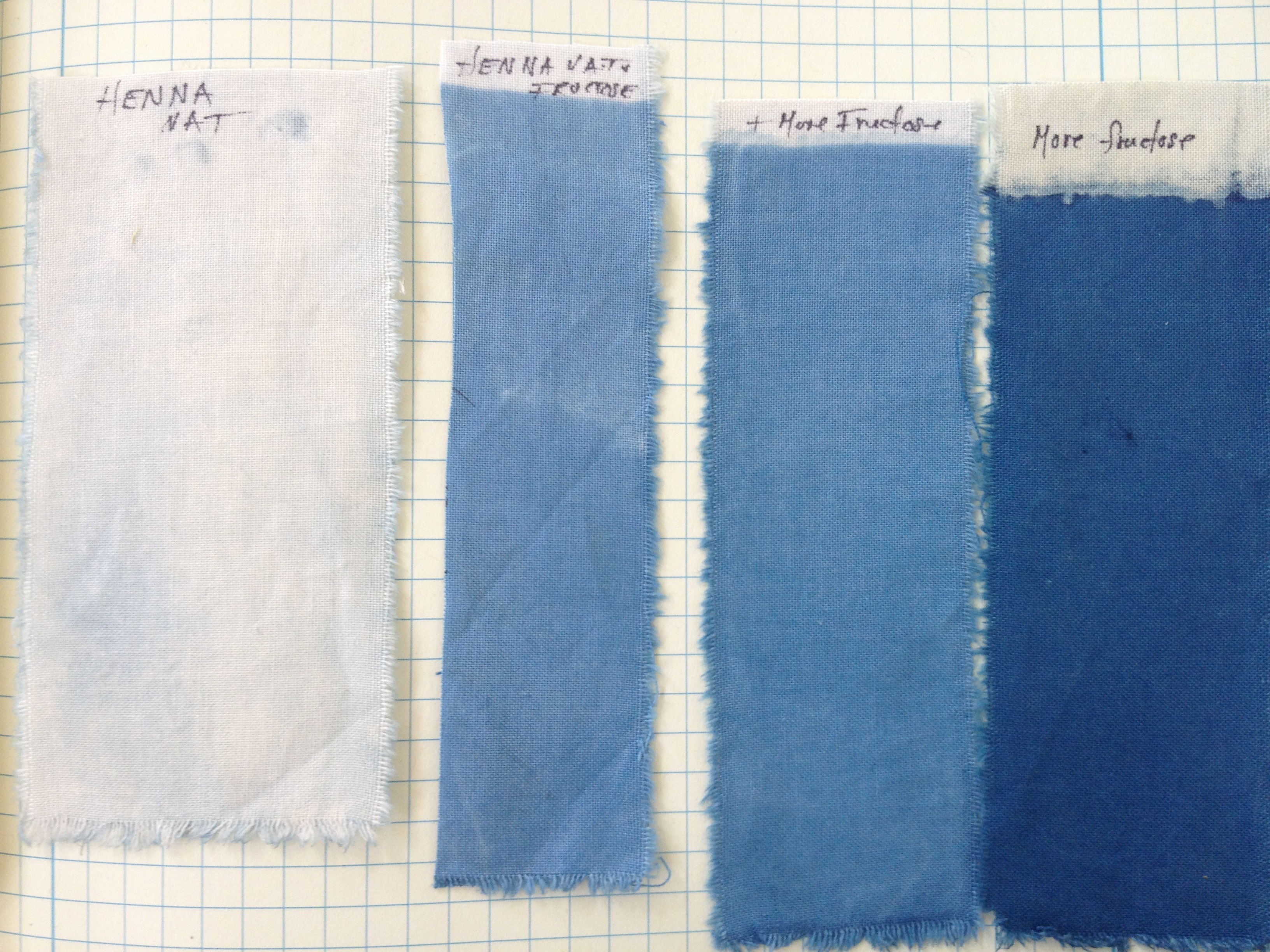 An indigo vat is happiest when it is used on a daily basis. After each dyeing session I “feed” it with a bit of fructose, stir it to bring the un-reduced indigo and reduction materials up from the bottom, check the pH, and let it rest for a few hours before dyeing again.