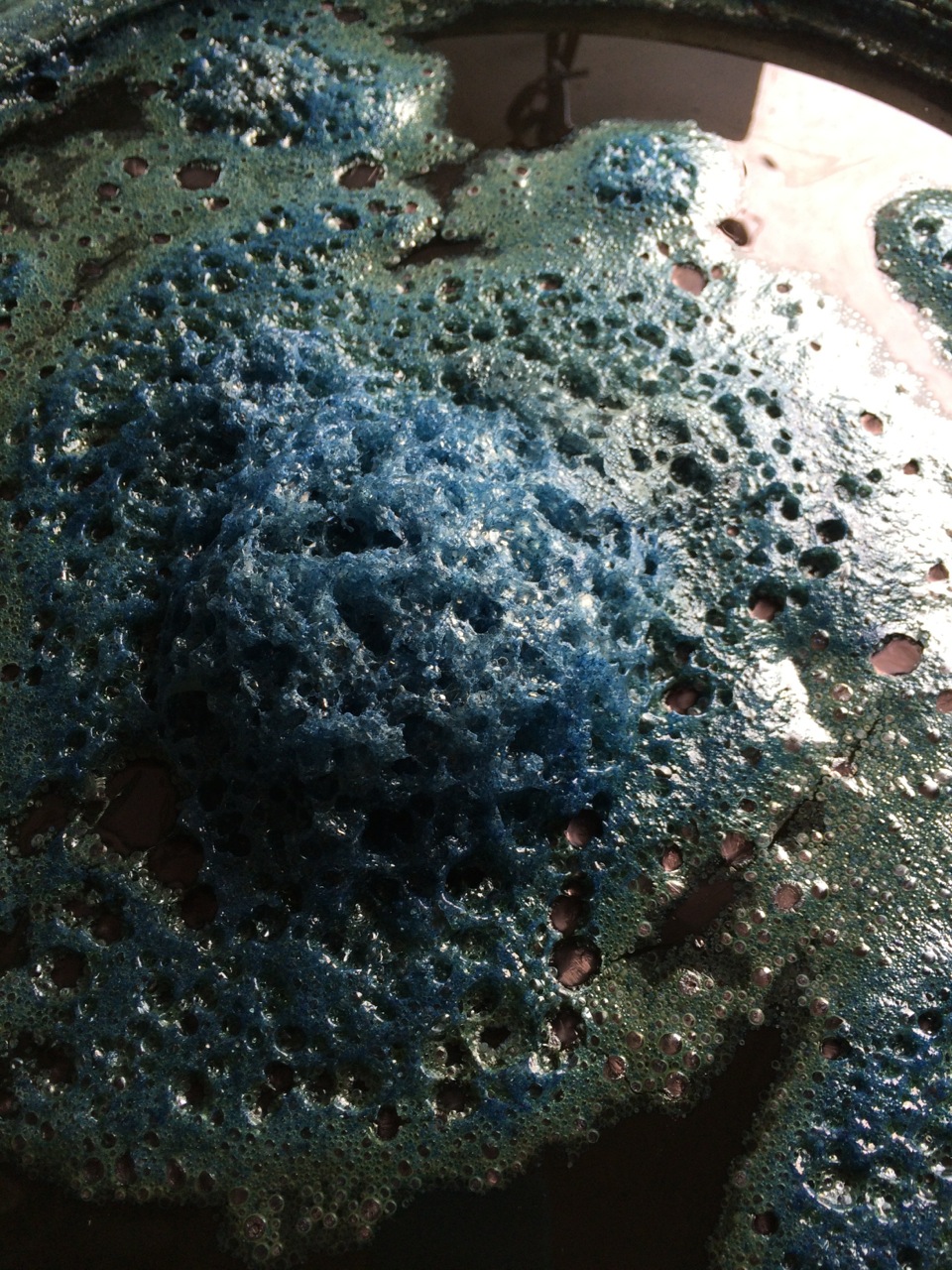 Occasionally I run into problems that I need to solve. Recently I was away from home for several weeks. Before I left, the vat was dyeing rich, deep blues. The color of the vat was a golden bronze and there was a good healthy “metallic” sheen on the surface and plenty of bubbles.