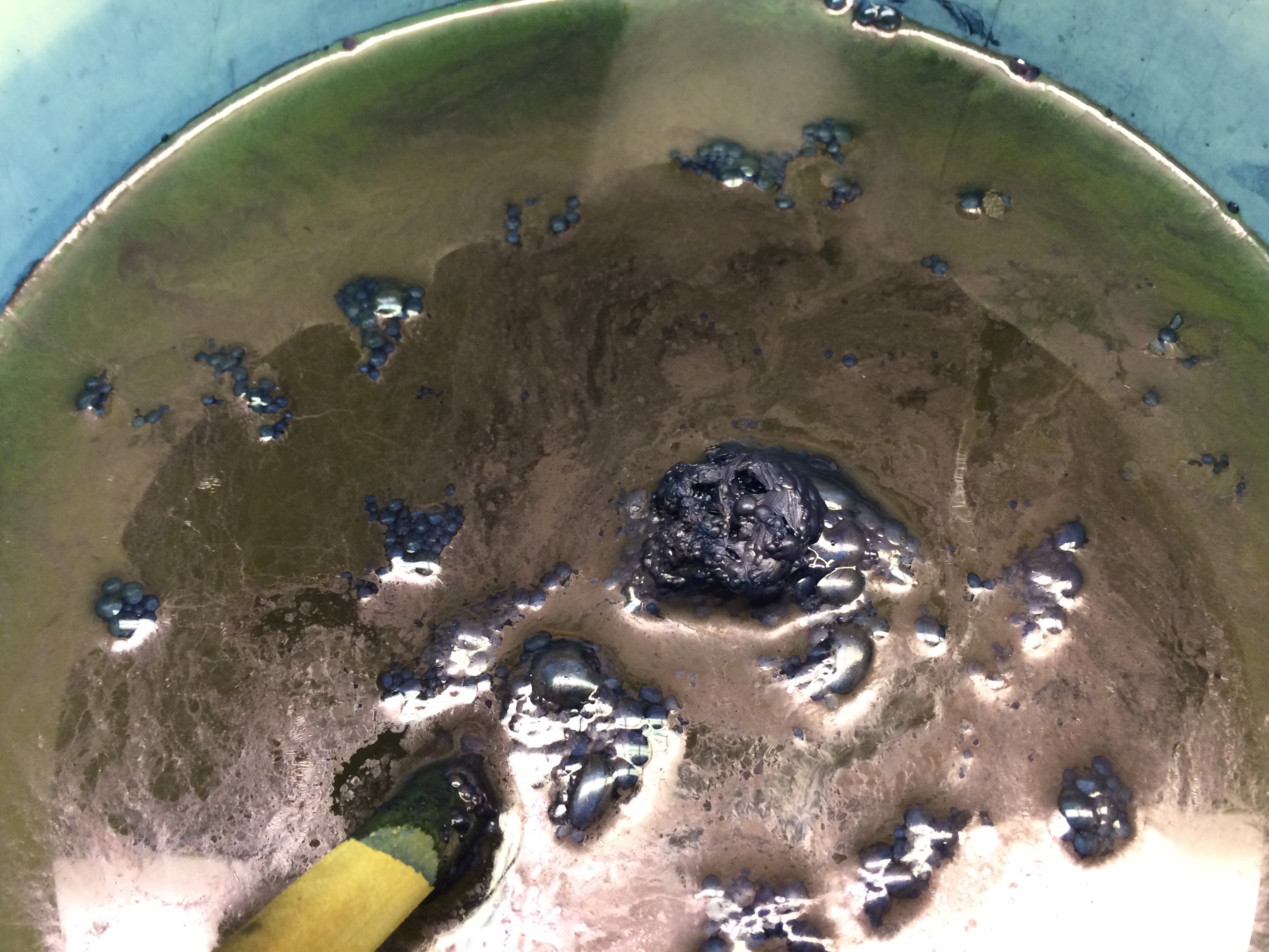 It was a revelation to be re-introduced to the “thiox vat”, a real “work-horse” indigo vat that is most appropriate for quick samples or when a hard-working vat is needed for a group of people or an intense dyeing period. I was pleasantly surprised to find that the dominant smell of the vat came from the natural indigo and not the reduction chemical.