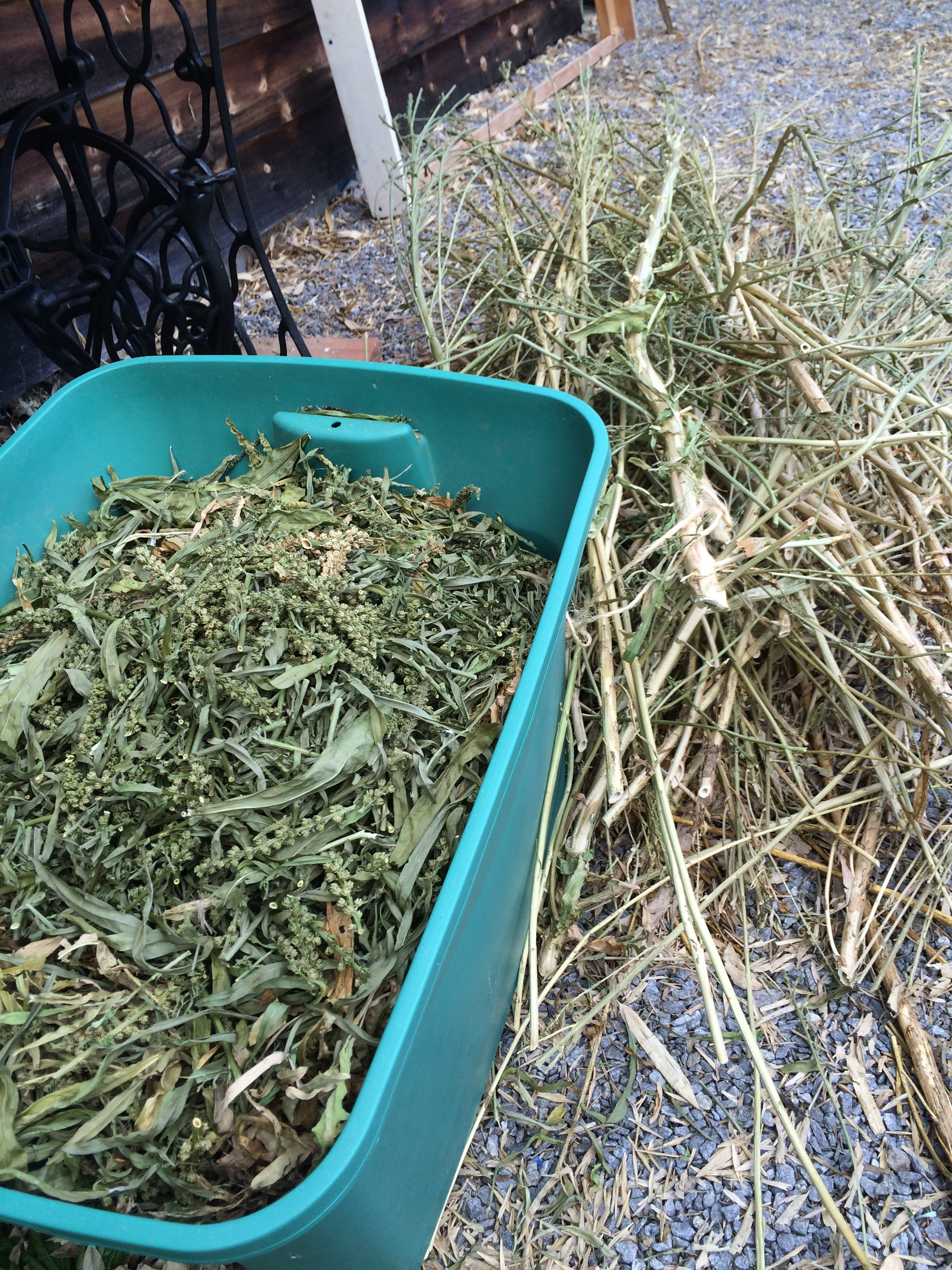 Dried weld (leave and flowers) stored for later use and the discarded stems, which don’t contain much dye.