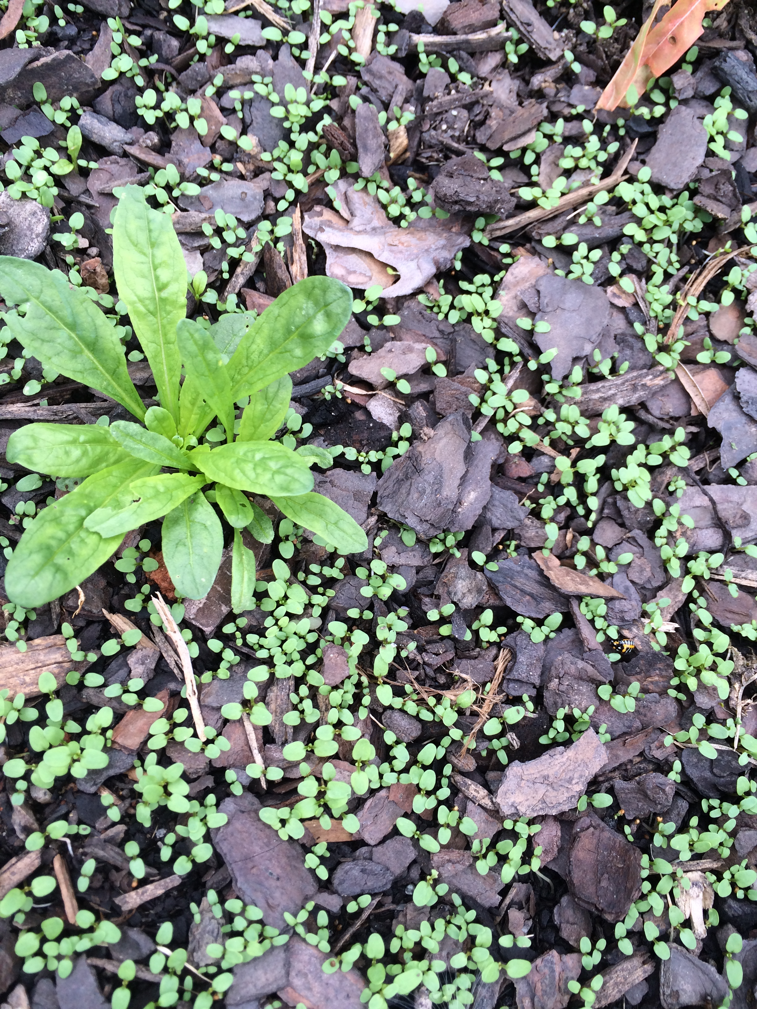 Weld seedlings in the gravel outside my studio, where I strip the plants after drying - Weld can be difficult and expensive to obtain. There are not many sources where weld can be purchased, either in extract or plant form. Growing and drying the dyestuff makes sense for the studio dyer.