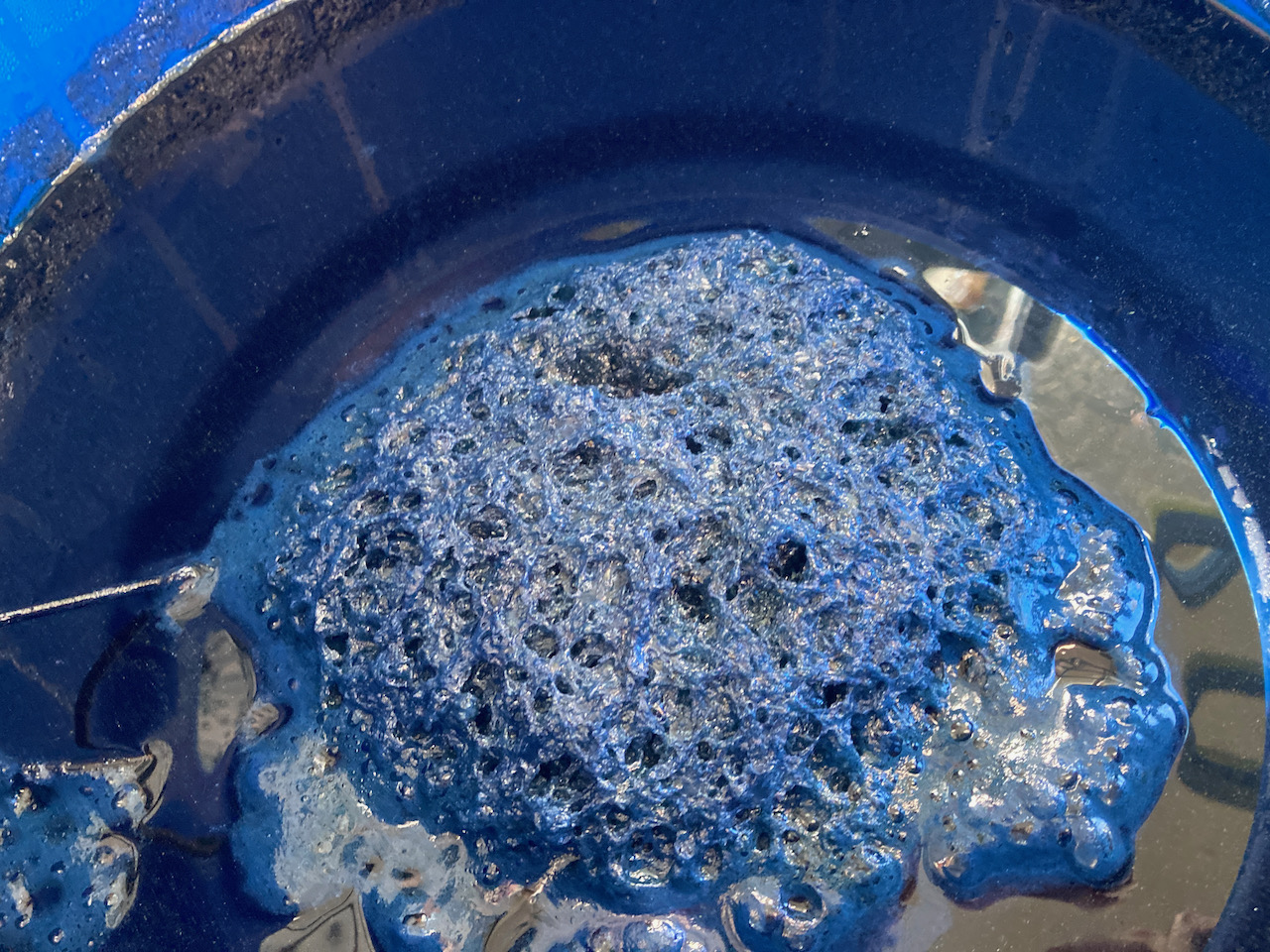 Once I started using indigo from Stony Creek I noticed that the water from the final boil was always tinted a purple hue. I assumed this was the indirubin that was being rinsed from the textile. Interestingly, I observed that the purple color in the boil water is temporary, and will disappear as the bath cools.