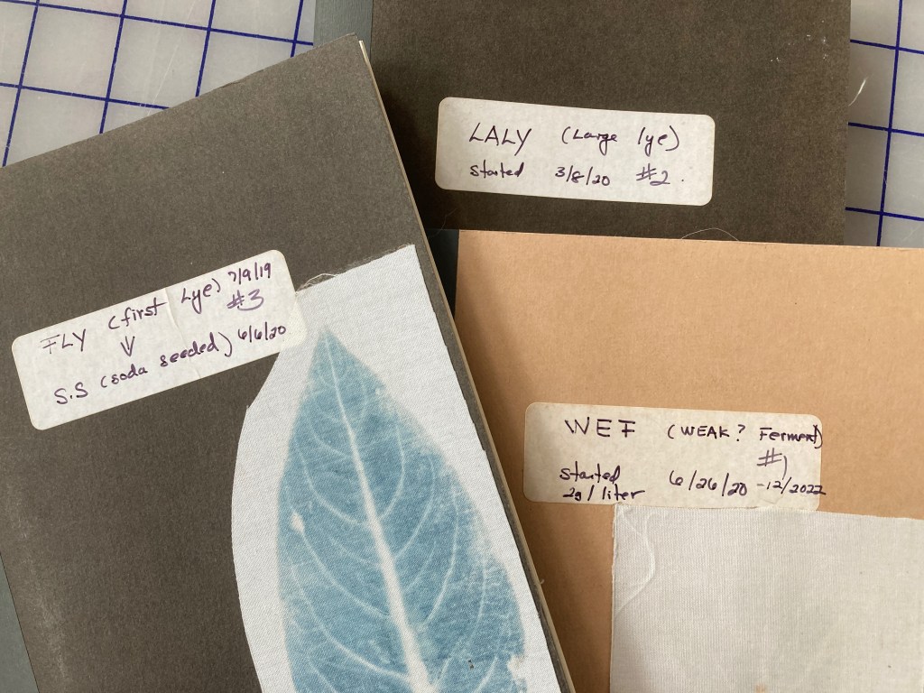 Early in 2022, while working on The Studio Formulas Set for the Art and Science of Natural Dyes, a new recipe and color match project with Schiffer Publishing (more to follow about that later). The color samples in this project required careful control of my indigo blues (as well as all the other dyes). I was happy to find that my original “weak” fermented indigo vat (WEF) was finally dyeing beautiful pale blues, while my two other vats were still producing deeper blues. Access to both weak and strong vats was key to controlling the shades of blue.