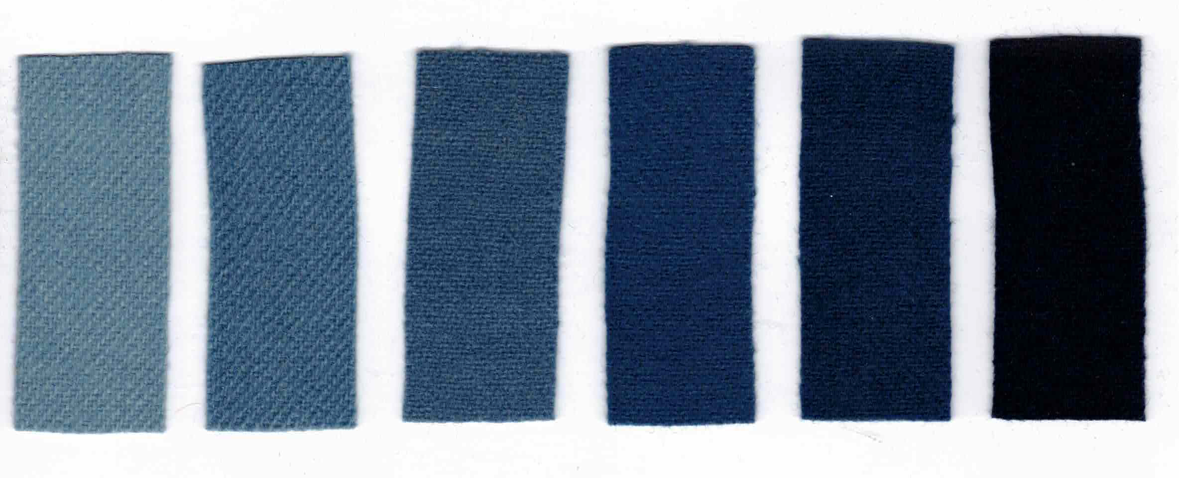 Note: when working with quick reduction vats, such as a fructose vat, I can easily control the depth of color by making weak vats (1-2 grams/liter) vs. strong vats (5-8 grams per liter). This combination of both weak and strong vats is very helpful in creating shades from light to dark, and when combing indigo with other dyes for greens, violets, etc.