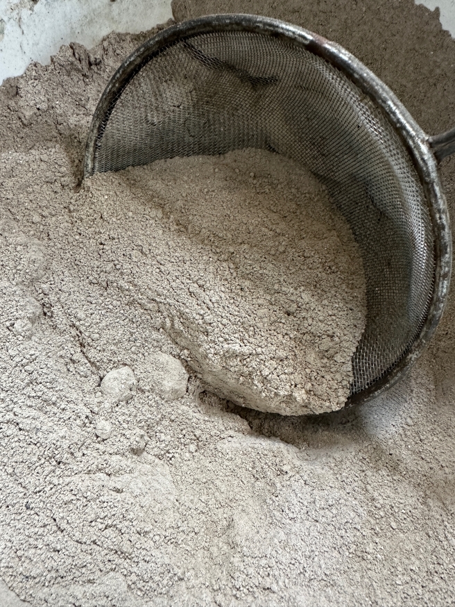 I use 3 kilos (about 6.5 pounds) hardwood ash, sifted. I sift the ashes through a coarse strainer/sieve to remove any large chunks. Fine ashes will make a more potent lye.