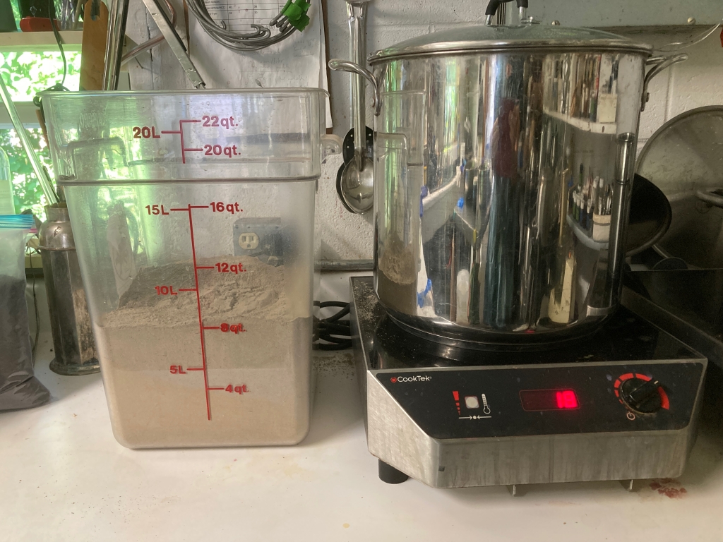 I also like to keep wood ash lye solution in the studio for topping up the liquid volume of all my fermented vats and for cooking the bran that is fed to the vat on a regular basis. This is also useful for vats made with soda ash or potash. So, don’t be intimidated by the need to make enough lye for an entire vat. You may want to start with smaller quantities and use it to simply top up your vat or use as a liquid for cooking your bran.