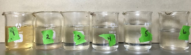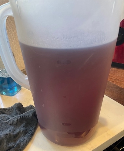 Photo of rinse water, sent to me by a dyer, with the following comment: “The four tea towels and three napkins were dyed with six ten-minute dips. They were dried. I then soaked them in water for several hours. Dumped the brown water soaked again and dumped brown water. Soaked overnight and the water was clear.”