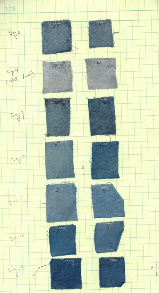 The same drop in pH happened on day 9. This illustrates how easy it is to read the condition of your vat from dyed samples. After day 13, I began using these vat for dyeing.