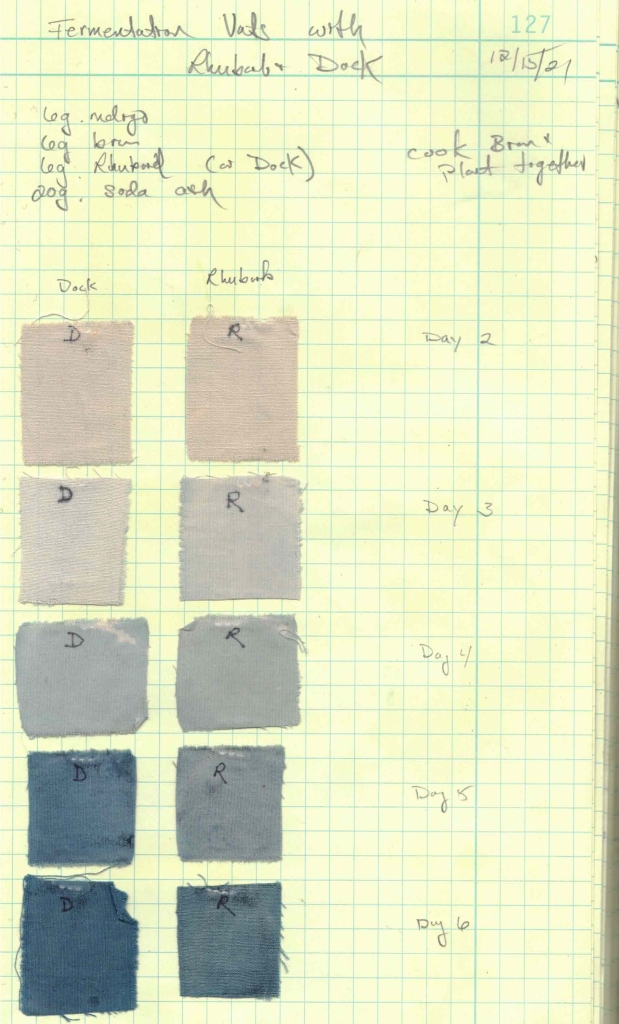 • Dedicate a small notebook to each vat that you build so that the vat can be observed over weeks/months. Place the dyed samples in your notebook.  This will be an important resource tool to understanding your vat.