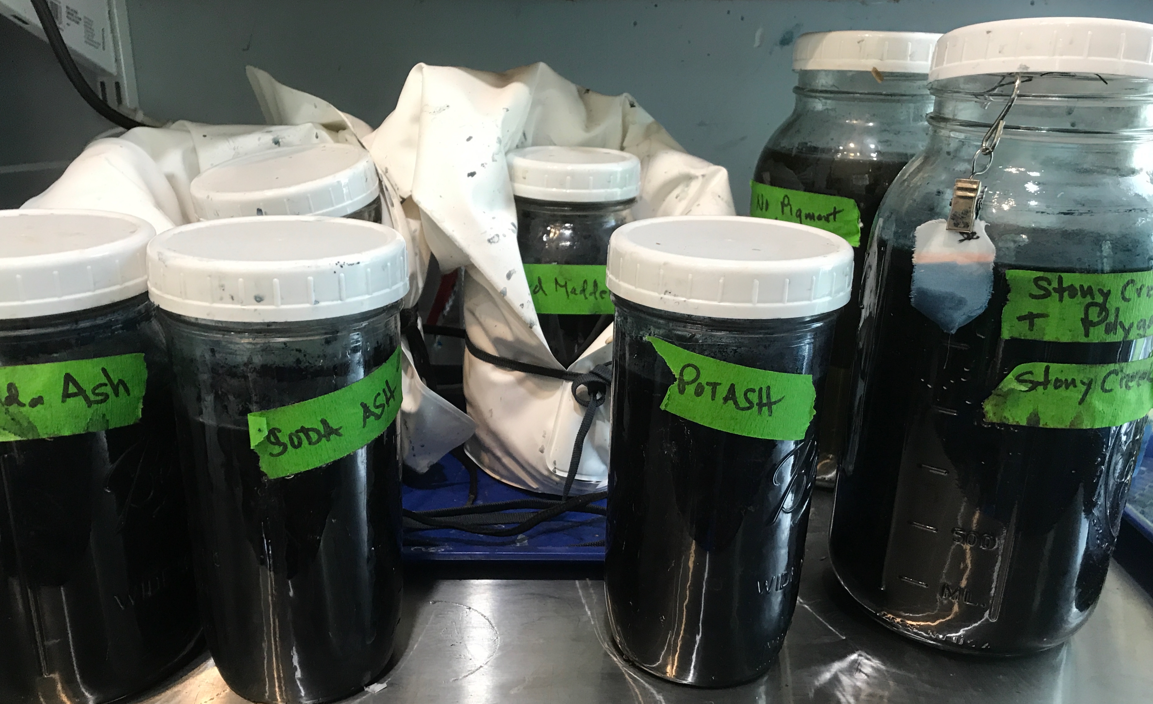 The vats described here are made with extracted indigo pigment. I prefer to use natural indigo pigment, but the vat can also be made successfully using synthetic pigment. I have had success using dried indigo pigment or indigo paste pigment (pigment that has been freshly extracted and never dried). I assume that paste pigment may still contain bacteria that will aid in the reduction of the vat which is, obviously, a plus.