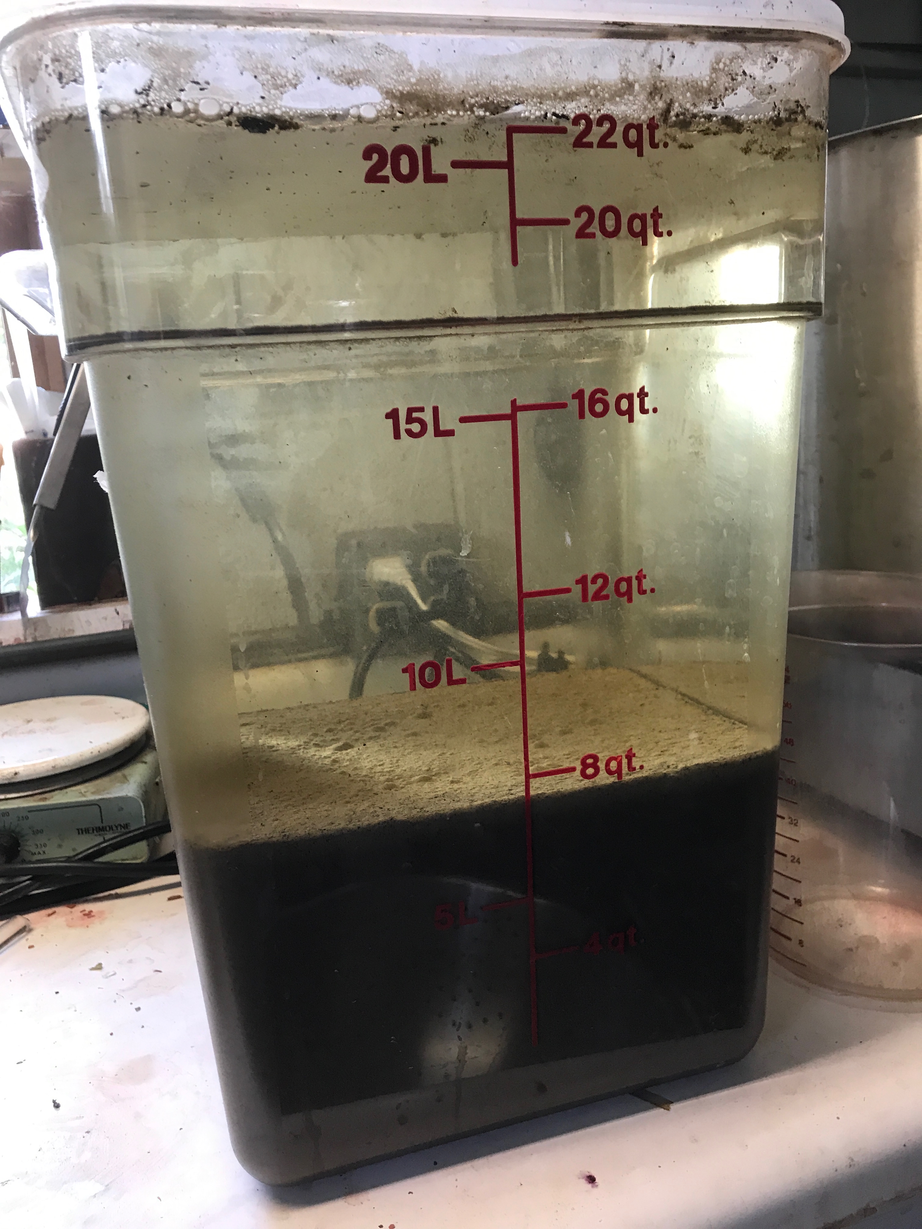 Vats that are kept a long time will build up solid materials on the bottom: mostly lime and wheat bran. When stirring the vat, there is noticeably more “stuff” on the bottom. I suspect that I have kept vats longer than might be recommended – I guess I may not be dyeing enough!