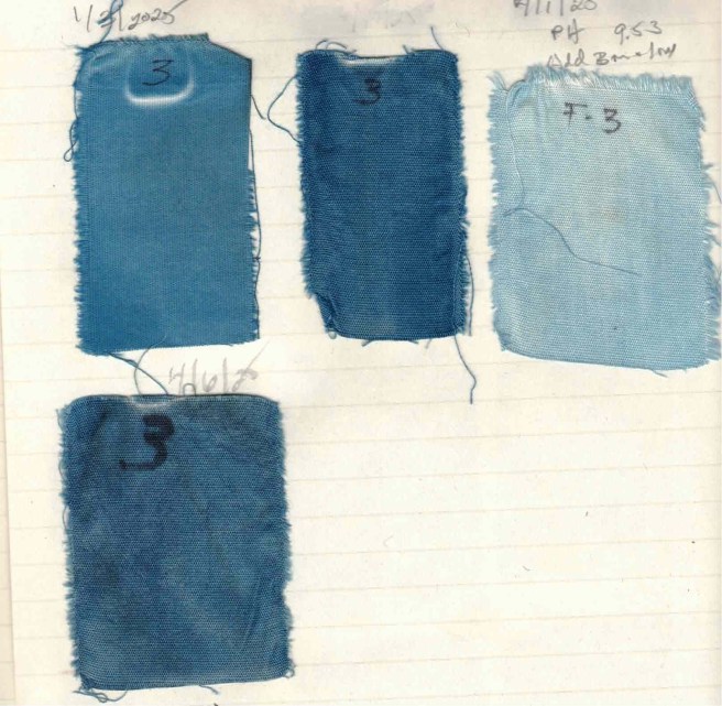 The world of indigo reduction, fermentation and dyeing is very complex.  There are so many decisions to make. Each dyer needs to think about and determine what works best for them. One of the comments made to the blog from Sophy Wong said: “root and rhubarb root.–Fructose powder: purified sugar.–Minerals: iron or zinc.–Microbes + fermented plants such as Tspecies in wheat/rice bran or sukumo indigo leaves.–Synthetic.” Yes,  Sophy, it’s a zesty mix of options!
