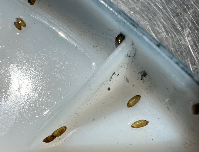 Small larvae on the inside cover of my vat. This is a sure sign that the pH is too low and it’s time to add lime. If allowed to hatch, you will have small flying insects.