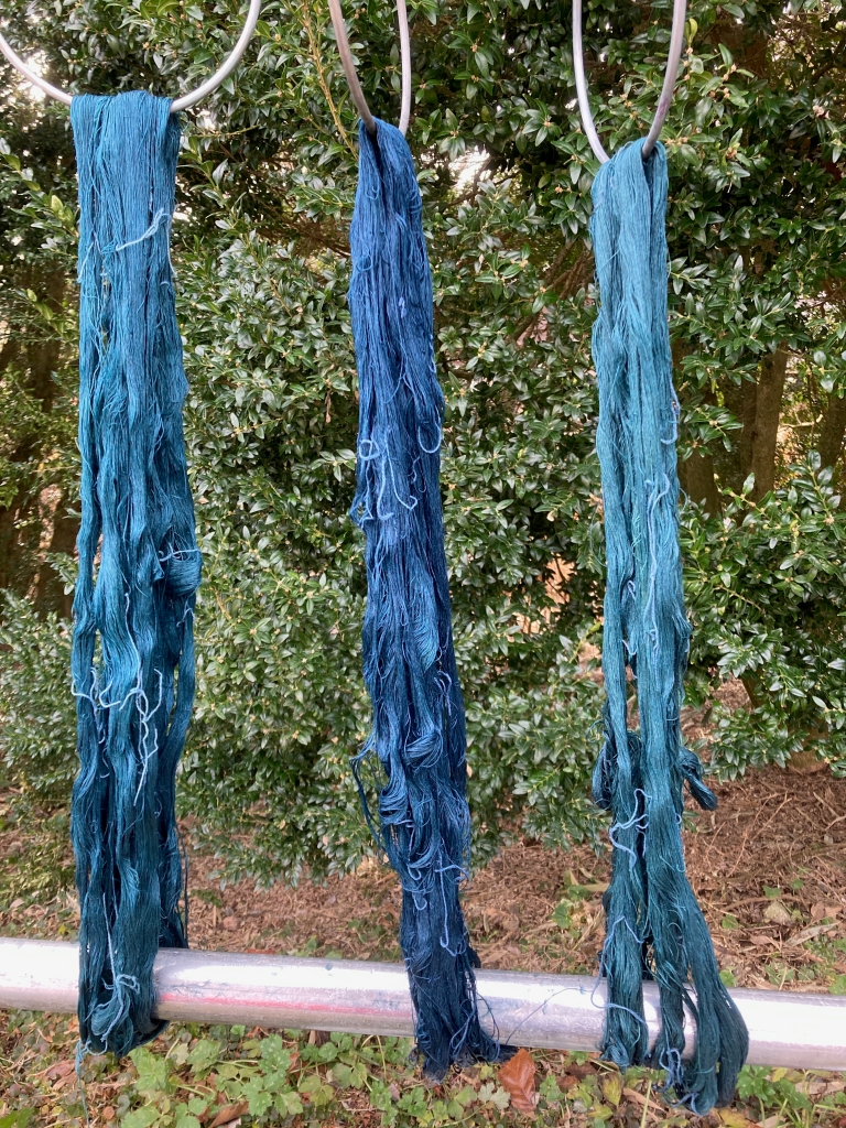 The palest of colors was dyed three times, for one minute each dip, in the weak vat. The darkest shade was immersed  6 times, 20 minutes each dip, in the strongest vat.