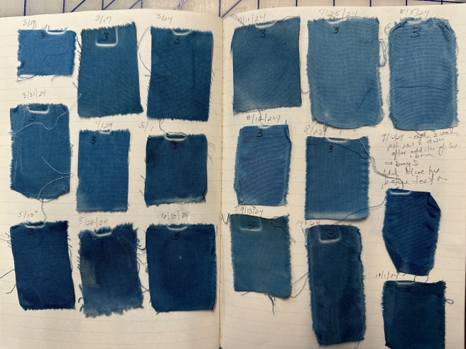 I believe that the time required to deplete the amount of indigo in the vat is directly related to the amount of dyeing that is done, or how quickly the indigo is used up or exhausted. If I had been dyeing a larger quantity of textiles, the pale colors would likely have “come on” sooner. If at all possible, the dyer might want to keep track of the amount/weight of textiles that are being dyed. That may not always be feasible for the casual dyer but a production dyer could more easily track this information.