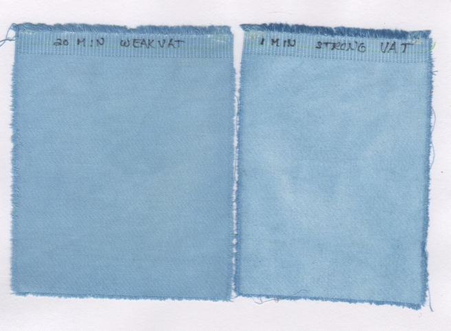 There is an additional reason why a weaker vat is valuable.  A vat that dyes a paler blue will invite long dips in the vat, and ultimately more “even” color.
