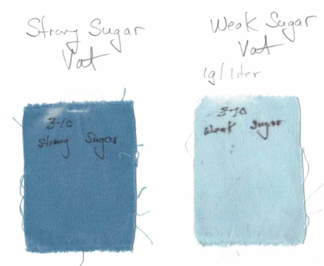 A fructose vat made with only 1 gram of indigo per liter will result in a much paler blue than a vat made with 8 grams of indigo per liter.
