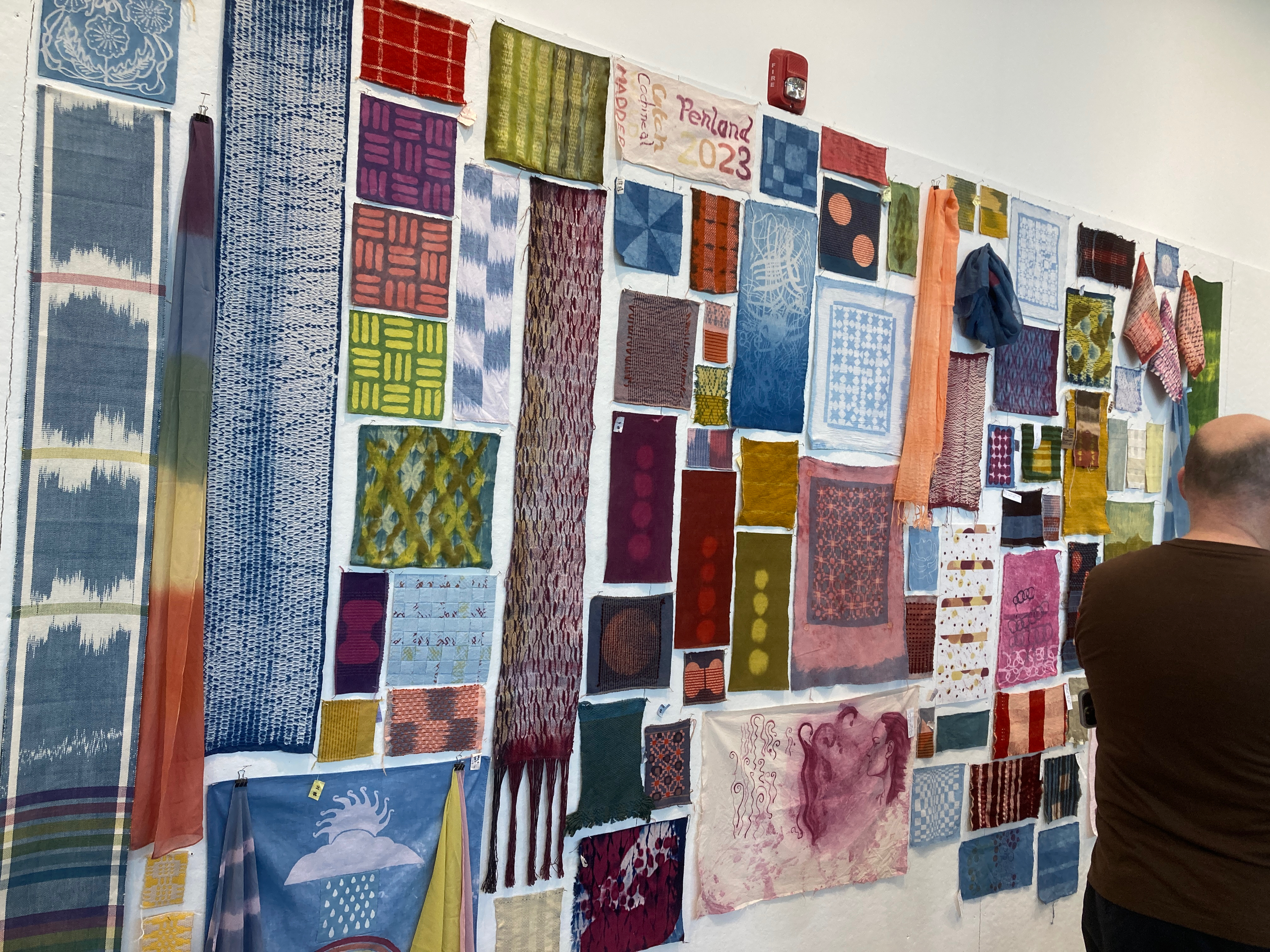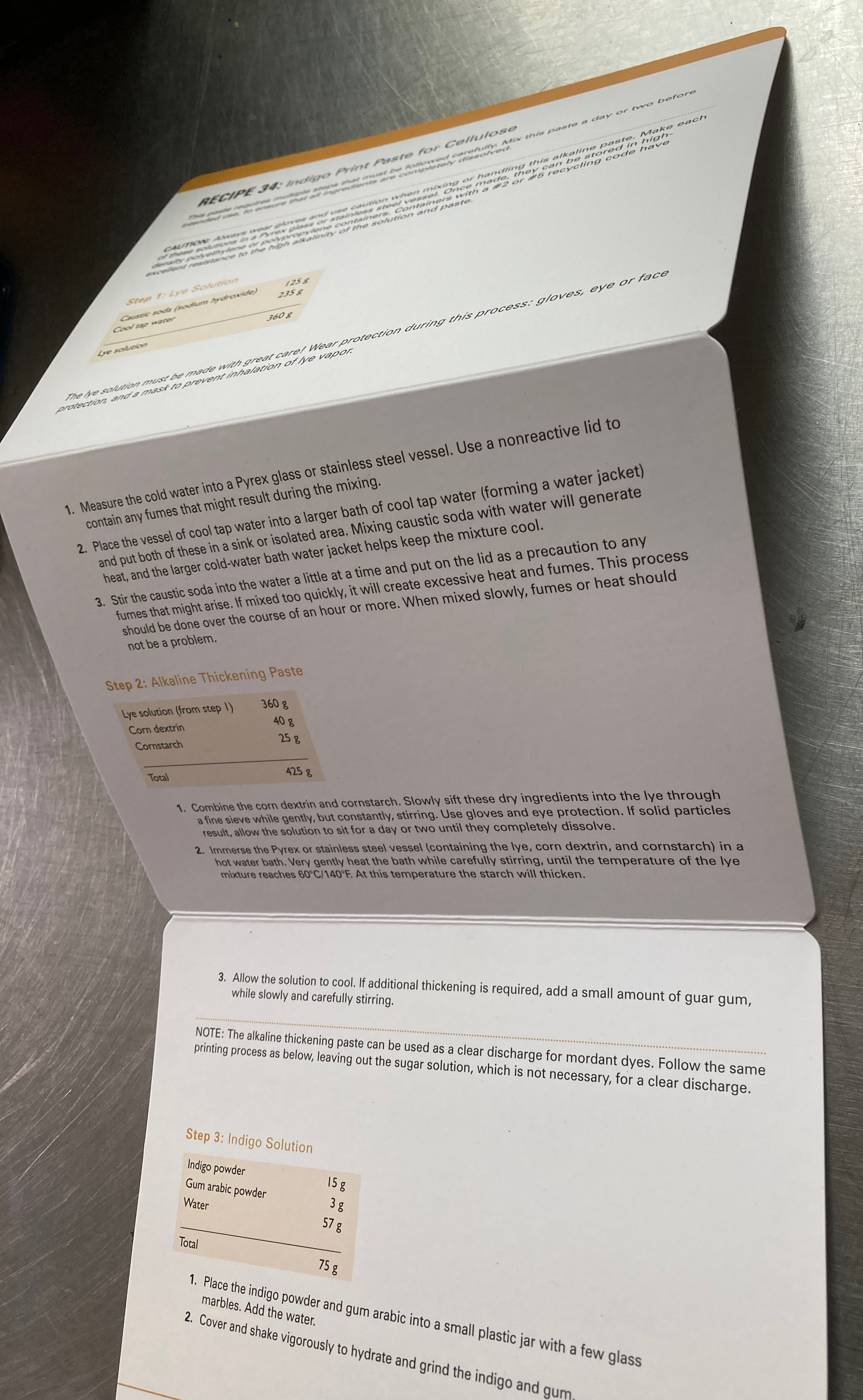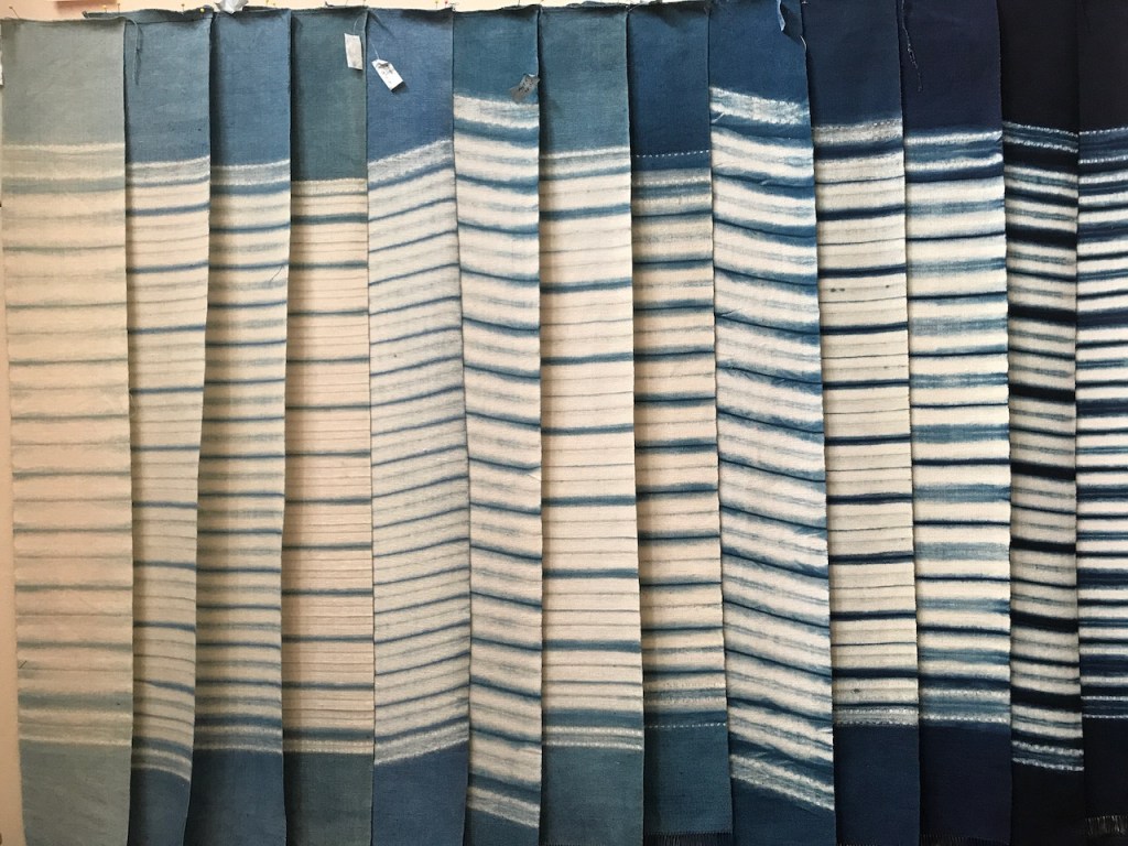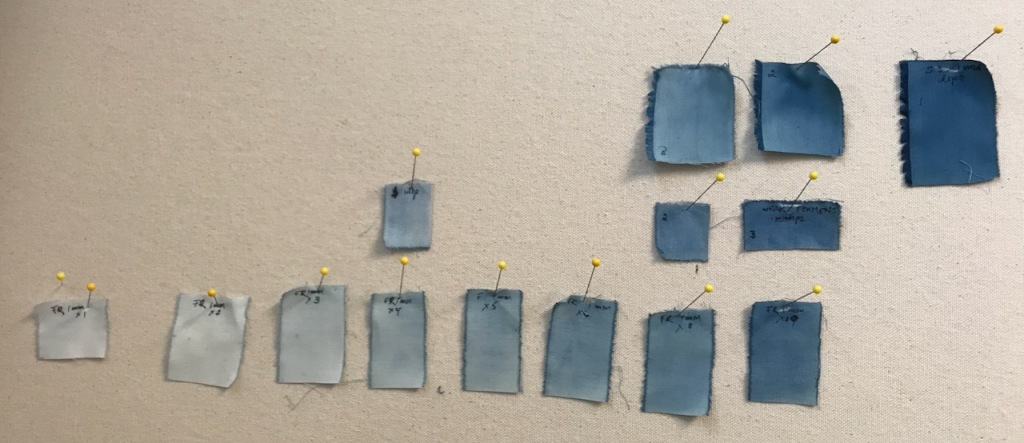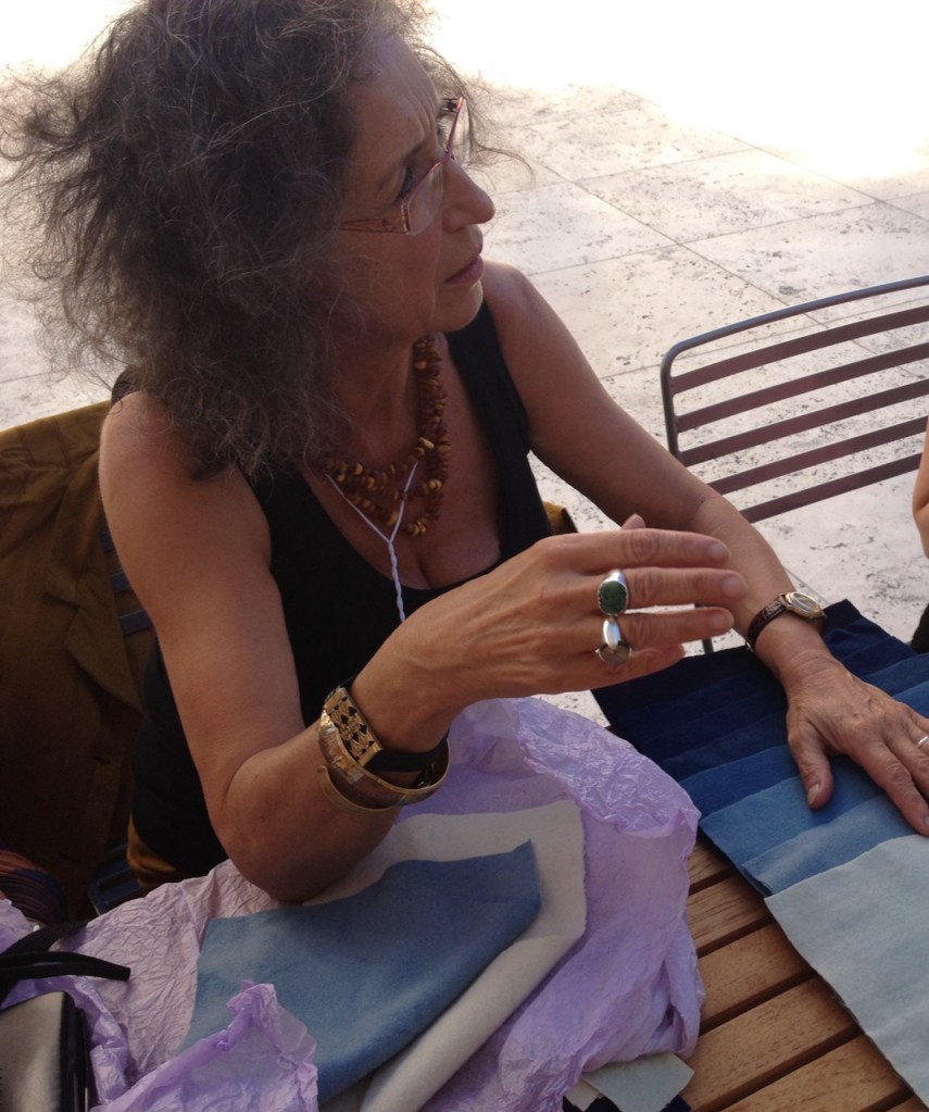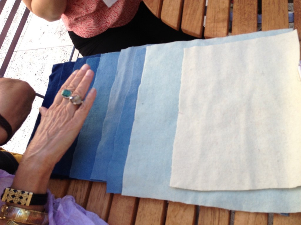 Each garment is dyed individually in indigo by Cara in an iron vat, and then carefully hosed off (with rain water) to rinse between immersions in the vat. Color mixes often include very carefully dyed shades of indigo, followed by mordanting and subsequent dyeing.
